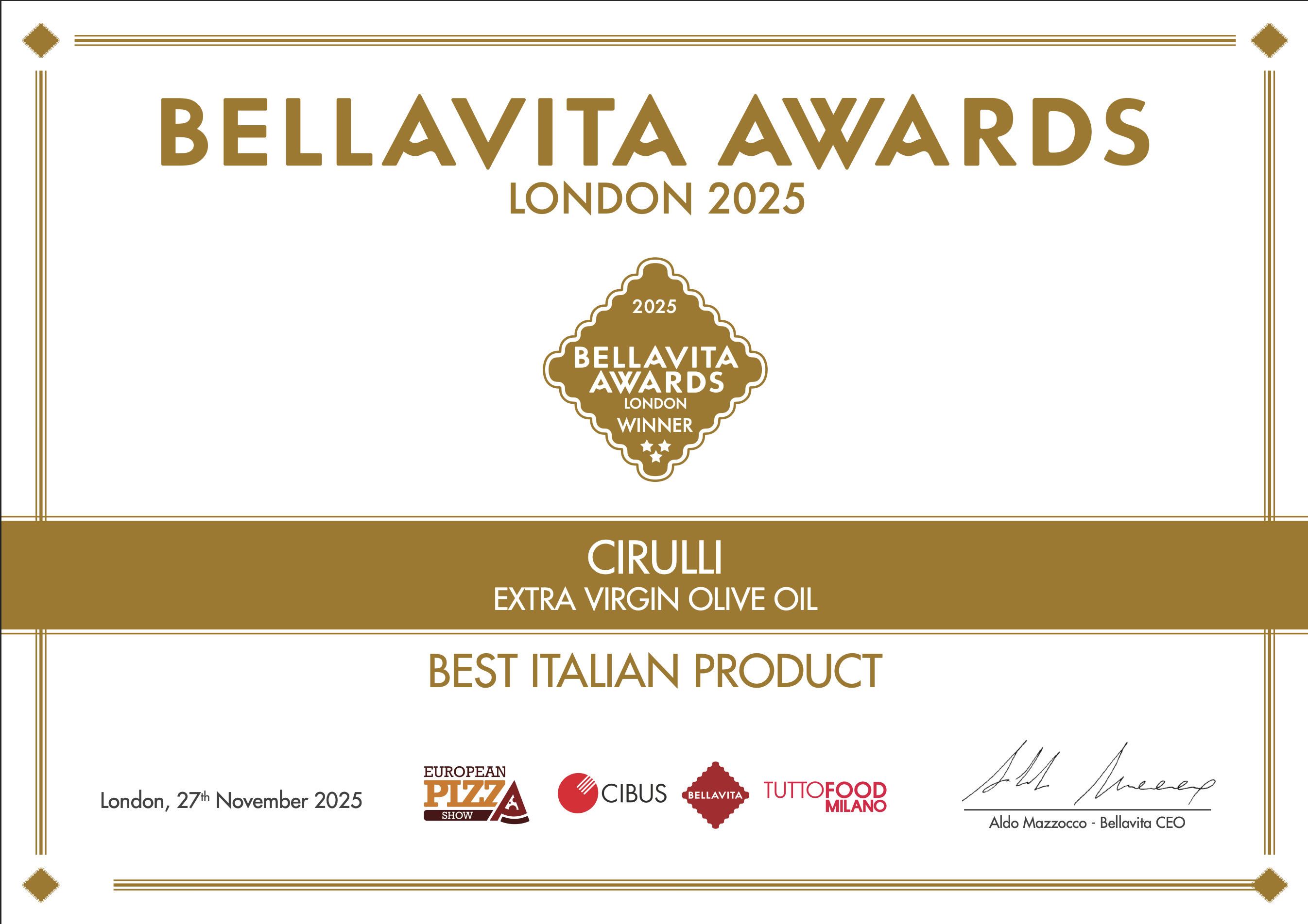 Unser natives Olivenöl extra wurde bei den Bellavita Awards London 2025 als Bestes Italienisches Produkt ausgezeichnet, eine Anerkennung, die von Einkäufern und Fachleuten der internationalen Lebensmittelbranche vergeben wird.